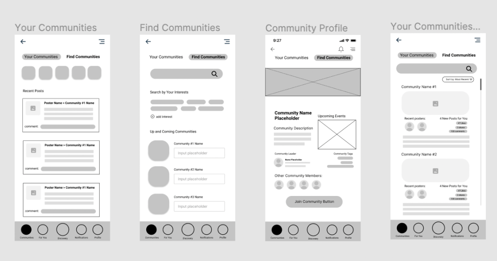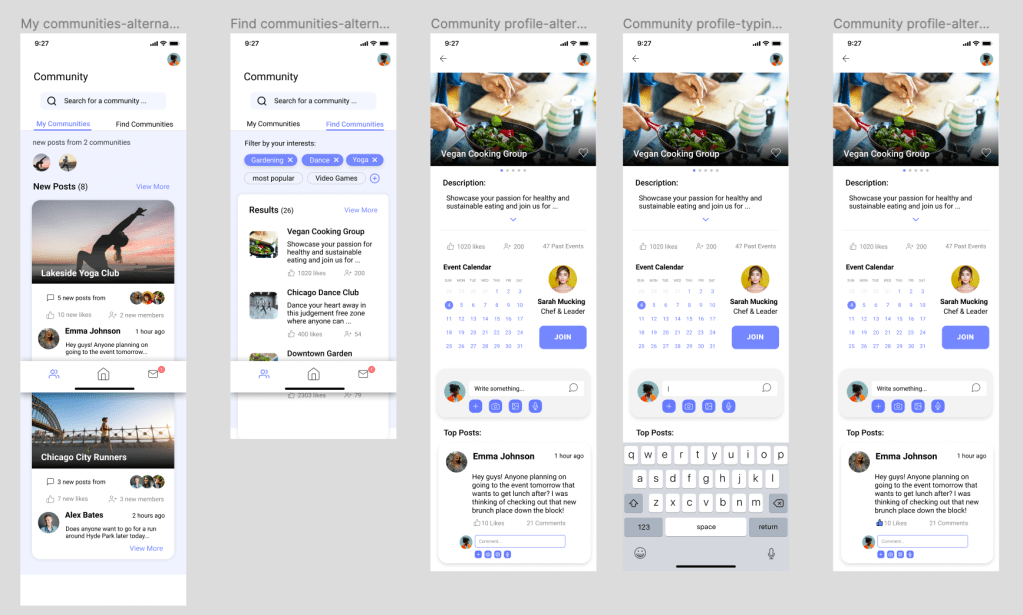 My team started the prototyping phase with simple paper prototypes. We divided the main features of the apps between each team member, individually paper prototyped these features, and conducted usability tests on these low fidelity prototypes. I was responsible for the Social Communities and Events feature.